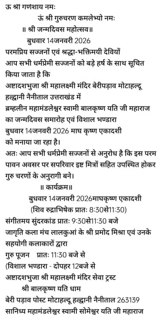 परम पूज्य पवाहारी महामंडलेश्वर स्वामी बालकृष्ण यति जी महाराज की पावन जयंती एवं माघ कृष्ण एकादशी 14 जनवरी को सुबह रुद्राभिषेक पूजन संगीतमय सुंदरकांड एवं गुरु पूजन के पश्चात दोपहर 12:00 बजे से विशाल भंडारे का आयोजन किया जाएगा उन्होंने अधिक से अधिक संख्या में भक्त जनों से इस शुभ अवसर पर महाप्रसाद ग्रहण करने की अपील की है
