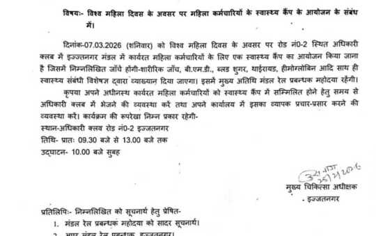 विश्व महिला दिवस पर पूर्वोत्तर रेलवे इज्जत नगर मंडल द्वारा महिला कर्मचारियों के लिए शनिवार 7 मार्च को स्वास्थ्य शिविर...