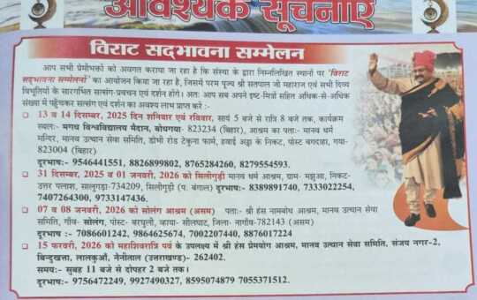 मानव उत्थान सेवा समिति द्वारा आगामी तीन माह में होने वाले बड़े सद्भावना सम्मेलन की तिथियां घोषित कर दी गई...