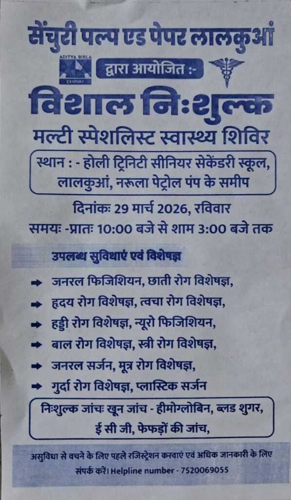 सेंचुरी पल्प एंड पेपर मिल लाल कुआं द्वारा कल रविवार को शहर में विशाल निशुल्क स्वास्थ्य शिविर का आयोजन कराया जाएगा शिविर में अनेक प्रकार की निशुल्क जांच के साथ-साथ अनेक स्वास्थ्य सुविधाएं उपलब्ध कराई जाएगी