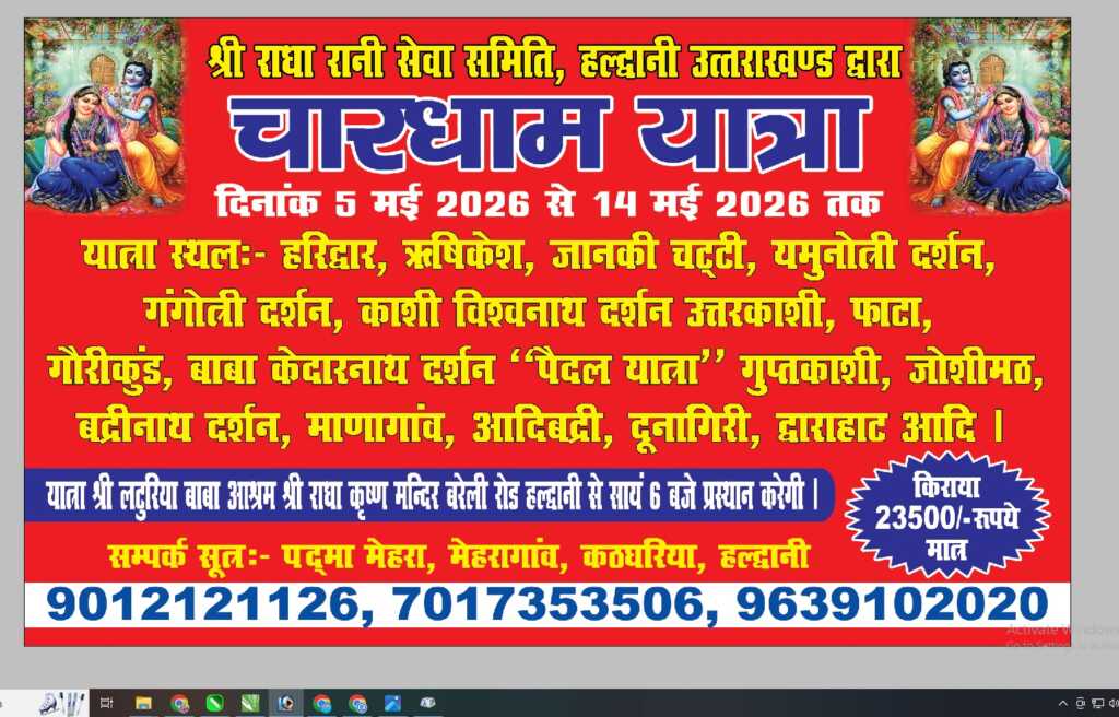 श्री राधा रानी सेवा समिति हल्द्वानी द्वारा श्रद्धालुओं के लिए बेहद किफायती खर्चे में चार धाम समेत अनेक स्थानों की यात्रा का आयोजन किया जा रहा है यात्रा संयोजिका श्रीमती पदमा मेहरा ने बताया कि