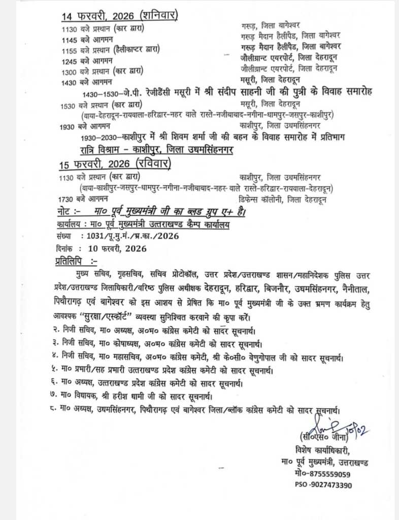 10 फरवरी से लेकर 15 फरवरी तक पूर्व मुख्यमंत्री हरीश रावत का विस्तृत कार्यक्रम दिया गया है