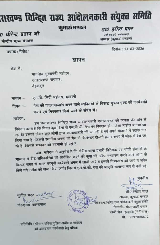 हल्द्वानी क्षेत्र में एल.पी.जी. गैस की कालाबाजारी और कृत्रिम किल्लत को लेकर आज उत्तराखण्ड चिन्हित राज्य आंदोलनकारी संयुक्त समिति के कुमाऊँ मण्डल अध्यक्ष डॉ. हरीश पाल तथा स्वराज हिन्द फौज के संस्थापक अध्यक्ष सुशील भट्ट के संयुक्त नेतृत्व में एक प्रतिनिधिमंडल ने एस.पी. सिटी मनोज कात्याल के माध्यम से मुख्यमंत्री को संबोधित ज्ञापन सौंपा। इस दौरान डॉ. हरीश पाल ने कहा कि कुछ लोगों द्वारा एल.पी.जी. गैस सिलेंडरों का अवैध भण्डारण कर बाजार में कृत्रिम संकट पैदा किया जा रहा है। इसके कारण आम जनता को भारी परेशानियों का सामना करना पड़ रहा है और गैस सिलेंडर लगभग दो-दो हजार रुपये तक ब्लैक में बेचे जा रहे हैं। उन्होंने प्रशासन से मांग की कि ऐसे लोगों के खिलाफ सख्त कार्रवाई करते हुए गुण्डा एक्ट के तहत मुकदमा दर्ज किया जाए, ताकि जनता की मजबूरी का फायदा उठाने वालों पर प्रभावी अंकुश लगाया जा सके।