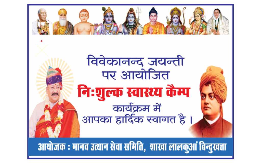 स्वामी विवेकानंद जी की पावन जयंती के अवसर पर कल 12 जनवरी को मानव उत्थान सेवा समिति द्वारा लालकुआं के अंबेडकर पार्क में निशुल्क स्वास्थ्य शिविर का आयोजन कराया जाएगा शिविर में हल्द्वानी से जाने-माने चिकित्सक अपनी सेवाएं प्रदान करेंगे उल्लेखनीय है कि हर वर्ष मानव उत्थान सेवा समिति द्वारा स्वामी विवेकानंद जयंती पर कार्यक्रम किए जाते हैं इसी के तहत इस वर्ष भी सदगुरुदेव श्री सतपाल महाराज जी की प्रेरणा से लालकुआं नगर के अंबेडकर पार्क में विशाल निशुल्क स्वास्थ्य शिविर का आयोजन किया जा रहा है