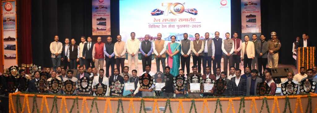 बरेली 19 फरवरी, 2026ः पूर्वोत्तर रेलवे पर 70वें रेल सप्ताह समारोह के अवसर पर महाप्रबन्धक श्री उदय बोरवणकर ने 19 फरवरी, 2026 को रेलवे प्रेक्षागृह, गोरखपुर में सांस्कृतिक कार्योक्रमों के साथ आयोजित भव्य समारोह में वर्ष-2024-25 में उत्कृष्ट कार्य करने वाले रेलकर्मियों को विशिष्ट रेल सेवा पुरस्कार वितरण कर सम्मानित किया। पुरस्कार प्राप्तकर्ताओं में विभिन्न विभागों के रेल कर्मी, निरीक्षक, इंजीनियर, चिकित्साकर्मी तथा अधिकारी सम्मिलित हैं। जिनकी समर्पित एवं उत्कृष्ट सेवा से रेल की कार्यप्रणाली में उल्लेखनीय सुधार हुआ है, उत्पादकता बढ़ी है, रेल दुर्घटनायें बचायी जा सकी हैं तथा तकनीकी सुझबूझ से आर्थिक स्वावलम्बन में बढ़ोत्तरी हुई है। महाप्रबन्धक श्री बोरवणकर ने इज्जतनगर मंडल को अन्तर्मंडलीय संरक्षा, पर्यावरण एवं हाउस कीपिंग प्रबंधन, लोको (परिचालन), कर्षण वितरण, लेखा, परिचालन, नागरिक केन्द्रित सेवा दक्षता कार्यकुशलता शील्डें एवं ट्राॅफियाँ प्रदान कर संबंधित अधिकारियों, पर्यवेक्षकों एवं कर्मचारियों को सम्मानित किया।