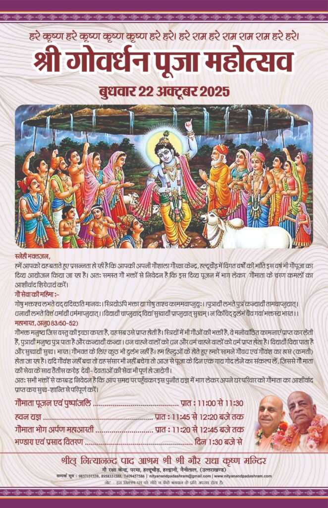 कुमाऊं के सबसे बड़े गौधाम श्रील नित्यानंद पाद आश्रम हल्दूचौड़ में गोवर्धन पूजा महोत्सव कल 22 अक्टूबर को धूमधाम से मनाया जाएगा गौधाम के उप महाप्रबंधक गोपीनाथ दास जी ने बताया कि आज दीपोत्सव का पर्व मनाया जाएगा और उन्होंने सभी भक्तजनों से भी आज दीपावली मनाने का आह्वान किया है गोपीनाथ दास जी ने कहा कि कल 22 अक्टूबर को हर वर्ष की भांति गोवर्धन पूजा महोत्सव धूमधाम से मनाया जाएगा बताया गया कि