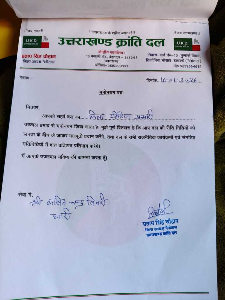 उत्तराखंड क्रांति दल के जिला अध्यक्ष प्रताप सिंह चौहान ने ललित चंद्र तिवारी को जिला मीडिया प्रभारी मनोनीत किया है