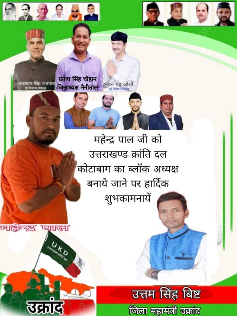 उत्तराखंड क्रांति दल ने संगठन का विस्तार करते हुए महेंद्र पाल को कोटाबाग का ब्लॉक अध्यक्ष मनोनीत किया है उत्तराखंड क्रांति दल के जिला अध्यक्ष प्रताप सिंह चौहान द्वारा दिए गए मनोनयन पत्र में महेंद्र पाल से संगठन को मजबूती प्रदान किए जाने की उम्मीद व्यक्त की गई है