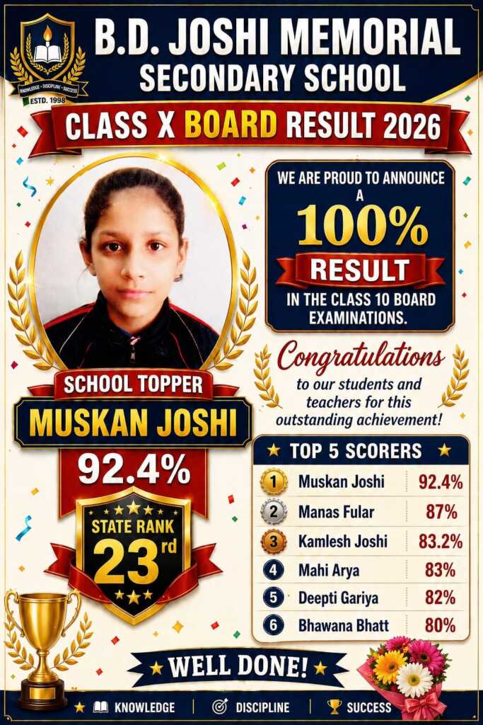 बिंदुखत्ता क्षेत्र के बेहद प्रतिष्ठित स्कूल बी डी जोशी मेमोरियल के विद्यार्थियों ने दसवीं की परीक्षा में जलवा बिखेरा है विद्यालय का परीक्षा फल शत प्रतिशत रहा है वही विद्यालय की मेधावी छात्रा मुस्कान जोशी ने 92.4% अंक प्राप्त कर हाई स्कूल की मेरिट लिस्ट में 23 वां स्थान हासिल किया है मुस्कान जोशी की शानदार सफलता पर सांसद विधायक पूर्व मंत्री समेत अनेक गणमान्य लोगों ने खुशी व्यक्त करते हुए समस्त विद्यालय परिवार को शुभकामनाएं दी हैं भोला दत्त जोशी एवं श्रीमती कल्पना जोशी की मेधावी बिटिया मुस्कान बचपन से ही कुशाग्र बुद्धि की रही है