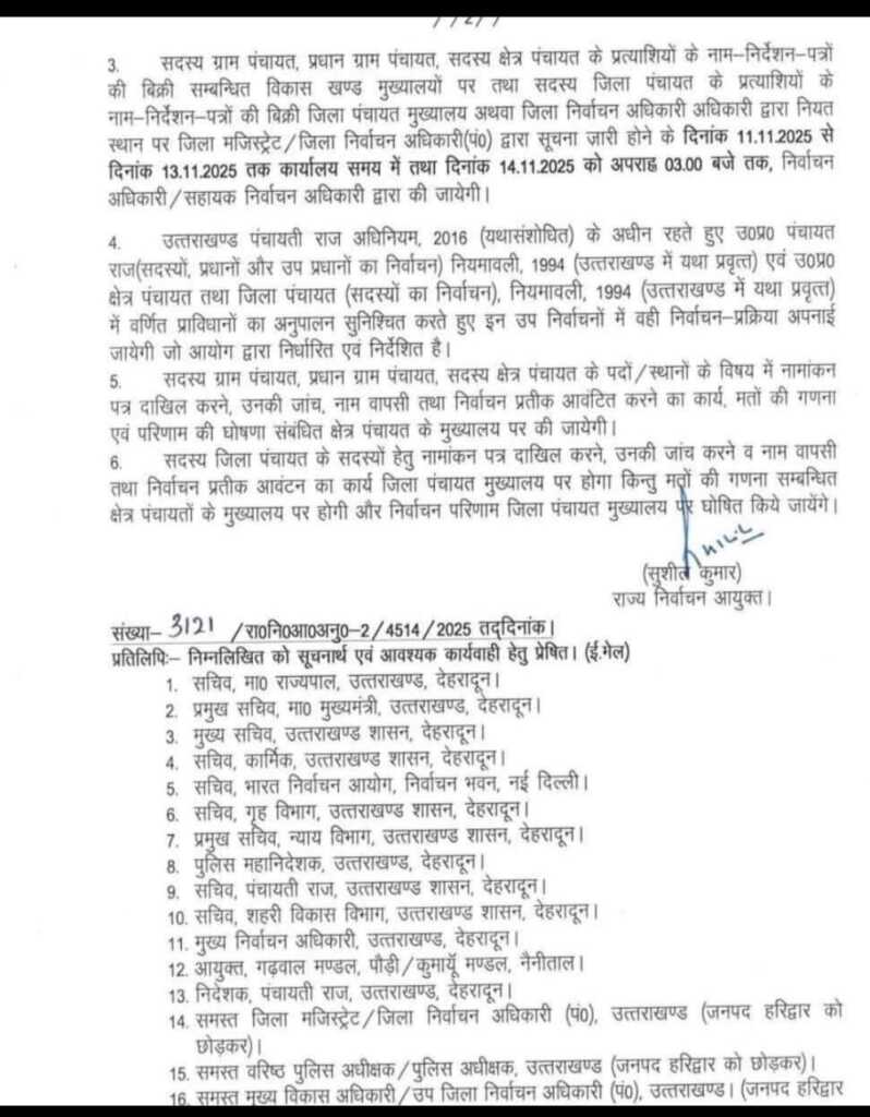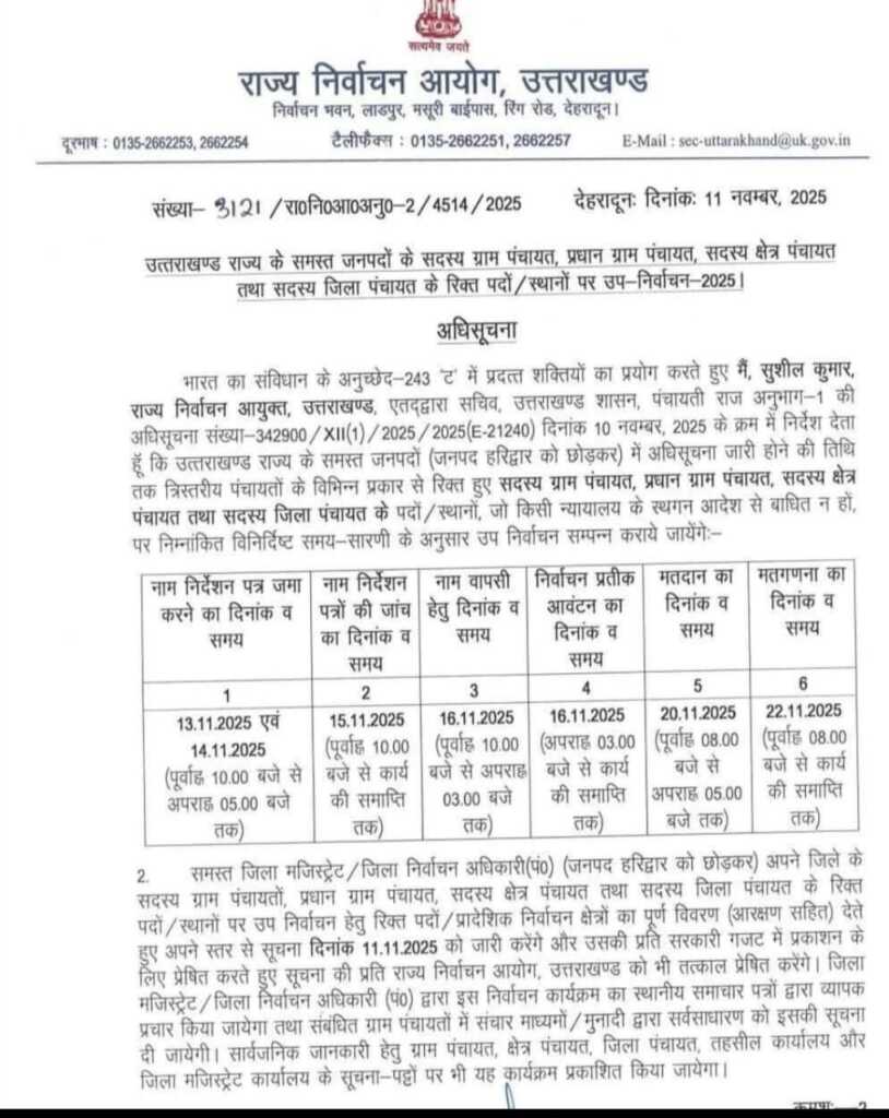 उत्तराखंड में त्रिस्तरीय पंचायत के रिक्त पदों की अधिसूचना जारी, इस दिन होगा मतदान