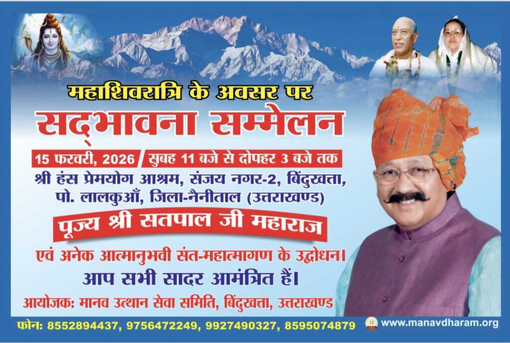 15 फरवरी को महाशिवरात्रि के पावन पर्व पर बिंदुखत्ता के श्री हंस प्रेम योग आश्रम संजय नगर में विराट सद्भावना सम्मेलन का आयोजन होगा सम्मेलन को अंतरराष्ट्रीय आध्यात्मिक संत सदगुरुदेव श्री सतपाल जी महाराज संबोधित करेंगे महाशिवरात्रि पर्व एवं सद्भावना सम्मेलन के मुख्य संयोजक मानव उत्थान सेवा समिति के राष्ट्रीय संगठन सचिव महात्मा सत्यबोधानंद जी ने विस्तृत जानकारी देते हुए बताया कि दिनांक 1 फरवरी 2026 रविवार को सुबह 10:00 बजे से दोपहर 1:00 तक महाशिवरात्रि महोत्सव को लेकर ,श्री हंस प्रेमयोग आश्रम बिंदुखता में एक विशेष बैठक रखा गया है,