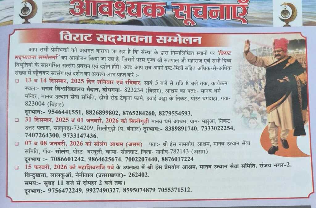 समेत बड़ी संख्या में श्रद्धालु मौजूद रहे पूज्य प्रचारिका बाई जी ने बताया कि 22 नवंबर को लाल कुआं के अंबेडकर पार्क में दोपहर 1:00 बजे से सत्संग का आयोजन किया जाएगा उन्होंने अधिक से अधिक लोगों से सत्संग स्थल पर पहुंचने की अपील की है