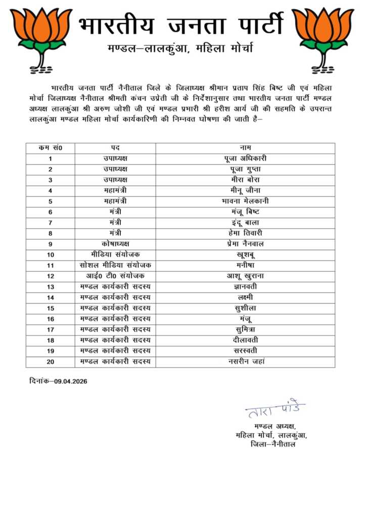 भारतीय जनता पार्टी महिला मोर्चा की लालकुआं नगर अध्यक्ष तारा पांडे ने कार्यकारिणी का विस्तार किया है टीम में तीन उपाध्यक्ष दो महामंत्री समेत 20 लोगों को शामिल किया गया है तारा पांडे ने सभी मनोनीत पदाधिकारियों को शुभकामनाएं देते हुए उनसे संगठन को मजबूती प्रदान किए जाने का आह्वान किया है भाजपा जिला अध्यक्ष प्रताप सिंह बिष्ट तथा महिला मोर्चा की जिला अध्यक्ष कंचन उप्रेती के दिशा निर्देशों के तहत भाजपा मंडल अध्यक्ष अरुण जोशी तथा प्रभारी हरीश आर्य की सहमति के उपरांत महिला मोर्चा की अध्यक्ष तारा पांडे ने कार्यकारिणी का विस्तार किया है तारा पांडे ने पूजा अधिकारी पूजा गुप्ता तथा मीरा बोरा को उपाध्यक्ष पद का दायित्व सौंपा है जबकि महामंत्री पद पर उन्होंने मीनू जीना तथा भावना मेलकानी की ताजपोशी की है मंत्री पद पर मंजू बिष्ट इंदु बाला तथा हेमा तिवारी को मनोनीत किया गया है