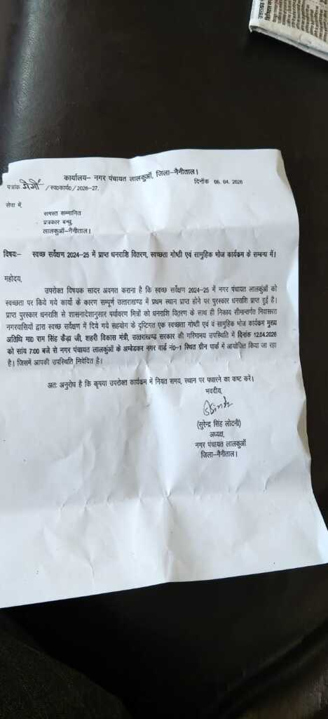 सुरेंद्र सिंह लोटनी ने बताया कि स्वच्छ सर्वेक्षण 2024 – 25 में प्राप्त धनराशि का पर्यावरण मित्रों को वितरण किया जाएगा इसके अलावा स्वच्छता गोष्ठी एवं सामुहिक भोज का भी कार्यक्रम रखा गया है इधर राम सिंह कैड़ा के मंत्री बनने के प्रथम बार लालकुआं आगमन को लेकर लोगों में उत्साह दिखाई दे रहा है