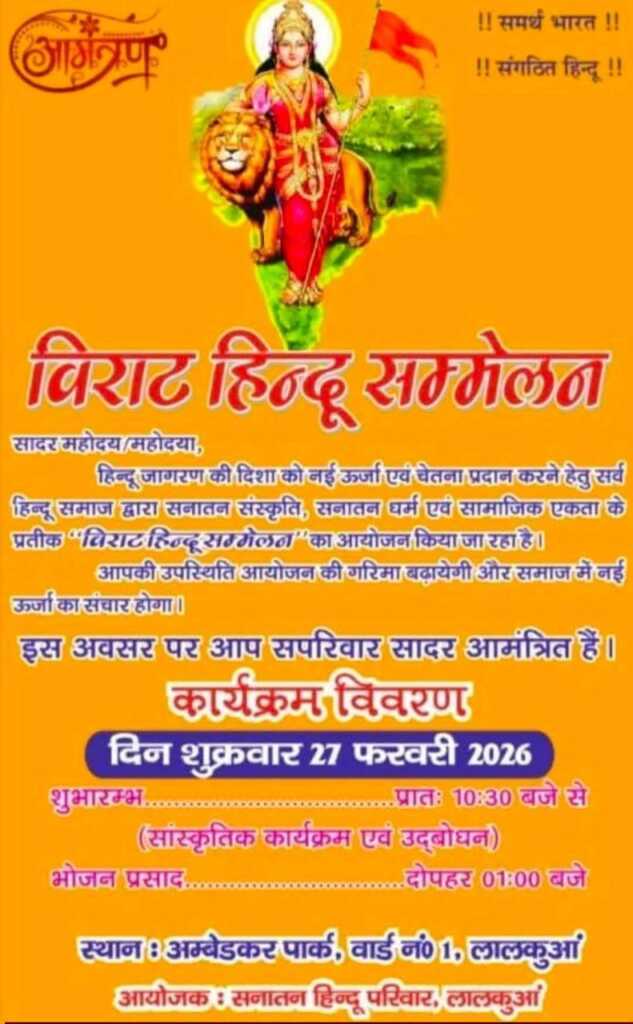 सनातन हिंदू परिवार द्वारा कल लालकुआं में विराट हिंदू सम्मेलन का आयोजन किया जाएगा यह सम्मेलन कल 27 फरवरी शुक्रवार को सुबह 10:30 बजे से नगर के अंबेडकर पार्क में शुरू होगा नगर के प्रमुख सामाजिक कार्यकर्ता एवं राधे-राधे सेवा समिति के अध्यक्ष संजीव शर्मा ने बताया कि